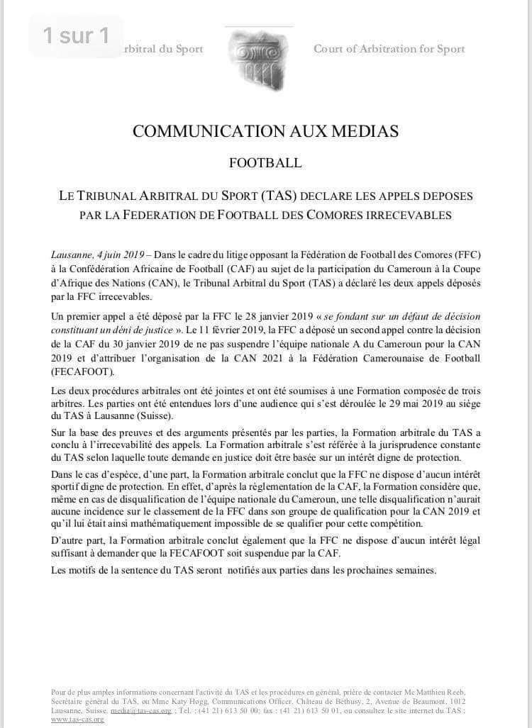 Le verdict a été donné par le TAS, les Comores n’iront pas à la Can 2019.