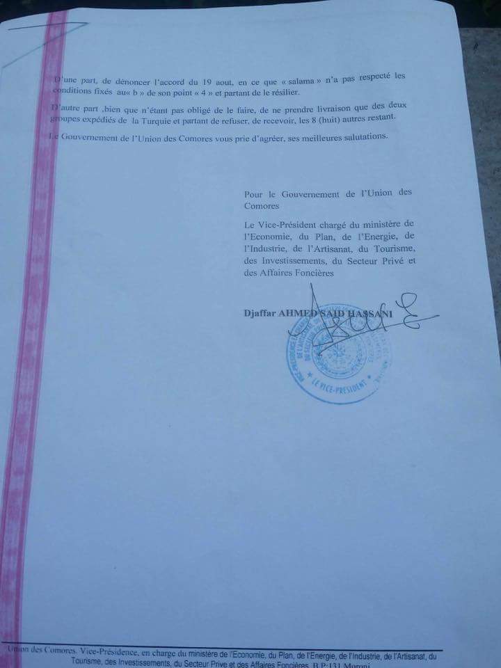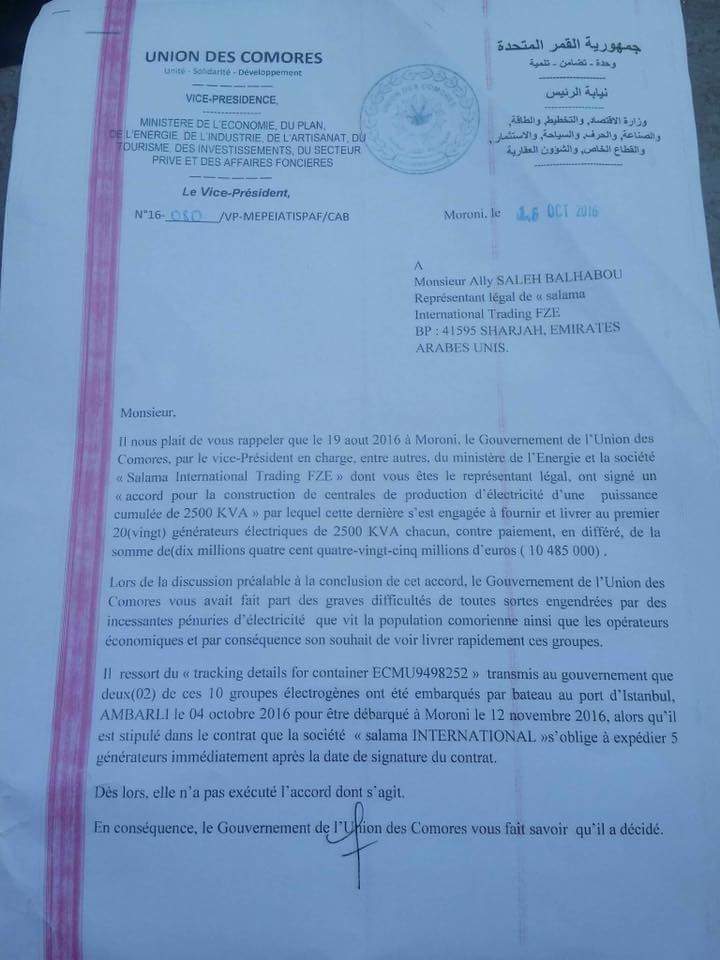 Selon la note N*16__080 en date du 16 octobre, seulement 2 groupes électrogènes (sur les 10 attendus) ont été embarqués d’Istanbul le 4 octobre et seront à Moroni le 12 novembre. Les 8 autres, le VP Djaffar n’en veut plus. Balhabou n’a pas honoré le contrat.