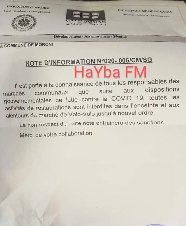 La Mairie de Moroni interdit les activités de restauration au tour et dans l’enceinte du marché de Volovolo.