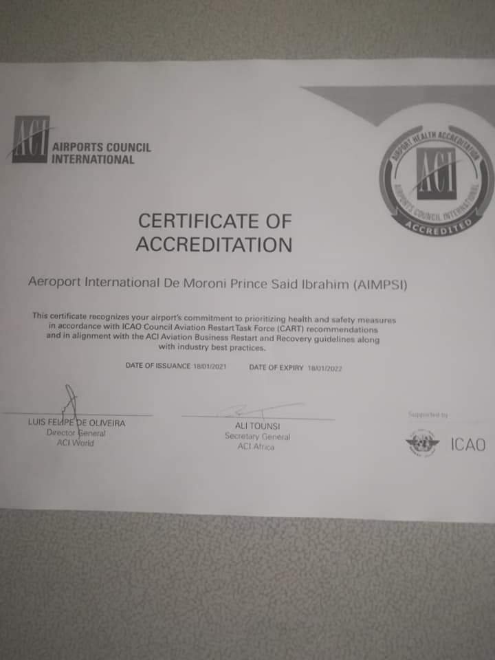 Les Aéroports des comores ont été classés 27 ème Aéroport sur 61 pays au niveau Mondial qui a respecté les recommandations du conseil international des aéroports (ACI) pour la lutte contre la propagation du pendemie du Covid 19 ce lundi 18 janvier 2021 suite à des séances des interrogations faites par le conseil international des Aéroports (ACI).