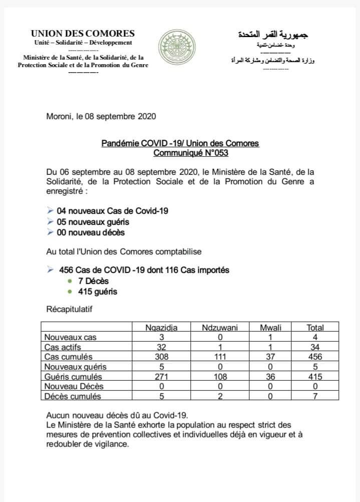 Les Comores comptent désormais 456 cas de Coronavirus dont 116 importés, selon le bulletin de santé sorti aujourd’hui par la coordination en charge de la lutte contre la COVID-19 aux Comores. 4 nouveaux cas sont enregistrés du 06 au 08 septembre 2020 dont 3 à la grande Comores et un à Moheli. Sur l’ensemble du territoire nationale comorien, 34 cas sont toujours actifs sont 32 à Ngazidja, 1 à Anjouan et 1 à Moheli. 415 peronnes dont 5 nouvelles ( toutes à Ngazidja) sont déclarées guéries.