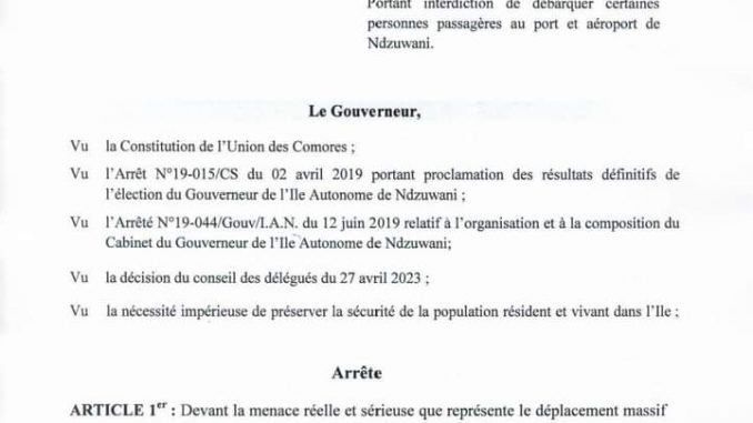 Le gouverneur de l’île autonome de Ndzuwani, Anissi Chamsidine, a publié un arrêté interdisant le débarquement de certaines personnes au port et à l’aéroport de Ndzuwani. Cette mesure fait suite à la menace que représente le déplacement massif de la population de Mayotte vers le reste de l’archipel.