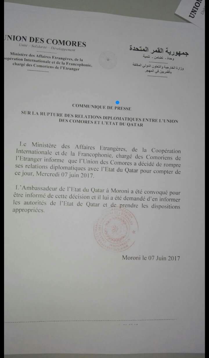 Le gouvernement du colonel Azali Assoumani vient de démontrer qu’il manque de direction et qu’il est aux petits oignons de l’Arabie Saoudite. En effet, à l’instar des Saoudiens, Egyptiens, Yéménites et Emiratis, les Comores viennent d’annoncer par un communiqué de presse du ministre des affaires étrangères, la rupture des relations diplomatiques avec le Qatar. Les autres ont des motifs valables pour rompre, mais les Comores ne sont rien d’autre que des suiveurs. « Le ministère des affaires étrangères et de la coopération internationale et de la francophonie, chargé des Comoriens de l’extérieur informe que l’Union des Comores a décidé de rompre ses relations diplomatiques avec l’État du Qatar » peut-on lire dans ce communiqué signé hier. Ce même document invite donc l’ambassadeur Qatari à Moroni de prendre les dispositions nécessaires. Entendez par là, qu’il doit faire ses valises et se barrer afin de ne pas froisser les Saoudiens. La question est de savoir ce que va advenir des investissements Qatari à Moroni à l’image de l’hôtel Retaj. Après l’Iran, Azali Assoumani se plie encore une fois à la volonté de l’Arabie Saoudite qui n’apporte pourtant rien en dehors des dattes.