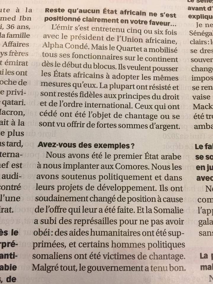 LA HONTE. Dans une interview au Magazine Jeune Afrique, le ministre des affaires étrangères du Qatar, Mohamed Abderrahmane Al Thani, cite les Comores comme étant un pays qui « s’est vu offrir de fortes sommes d’argent » pour trahir le Qatar, alors que les qataris soutenaient notre développement. Il cite en contre-exemple la Somalie qui malgré la pauvreté a refusé le chantage saoudien et est resté neutre. Voilà l’image que l’on a à l’international un pays qui trahit ses amis pour de l’argent.