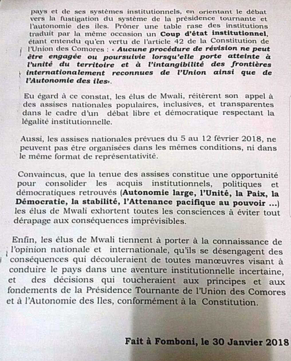 Enfin, les élus de Mwali tiennent à porter à la connaissance de l’opinion nationale et internationale, qu’ils se désengagent des conséquences qui découleraient de toutes manœuvres visant à conduire le pays dans une aventure institutionnelle incertaine, et des décisions qui toucheraient aux principes et aux fondements de la Présidence Tournante de l’Union des Comores et à l’Autonomie des Iles, conformément à la Constitution.