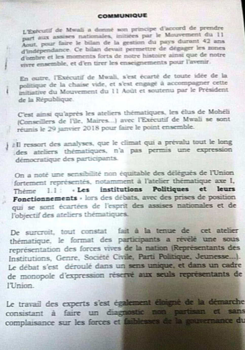 En outre, l’Exécutif de Mwali, s’est écarté de toute idée de la politique de la chaise vide, et s’est engagé à accompagner cette initiative du Mouvement du 11 Août et soutenu par le Président de la République.