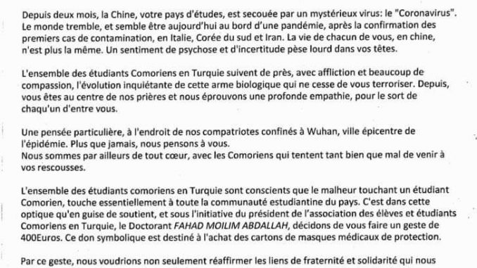 Les étudiants comoriens en Turquie envoient un don de 400euros aux étudiants comoriens en chine et lancent un appel aux autres associations estudiantines d’emboîter leurs pas.