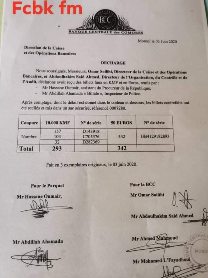 Saisis le mois de mai par les autorités publiques, les << faux billets » sont déjà transmises à la banque centrale, selon une note de décharge signée le 3 juin 2020. « Après comptage, dont le détail est donné dans le tableau ci-dessus, les billets contrefaits ont été scellés et mis dans un sac sécurisé, référencé 0007280 ».