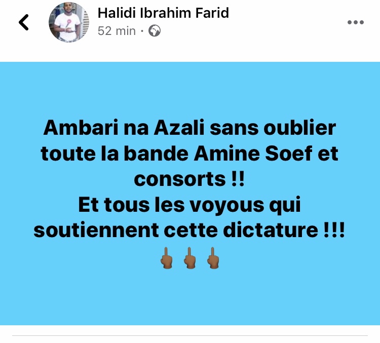 Le fils de l’ancien premier ministre Ibrahim Halidi ne met de gants quand il fait s’en prendre au ténors du pouvoir. Comme beaucoup de Comoriens en général et d’Anjouanais en particulier, il a une haine viscérale contre Azali qu’il qualifie d’ « imbécile ». Il a déjà appelé les Anjouanais à révolte par les armes contre le régime. Il fait aujourd’hui un doigt d’honneur au couple présidentiel et les proches. À lire aussi:👉https://www.comoresinfos.net/le-fils-de-lancien-premier-ministre-ibrahim-halidi-traite-azali-d-imbecile-et-fait-appel-aux-armes/