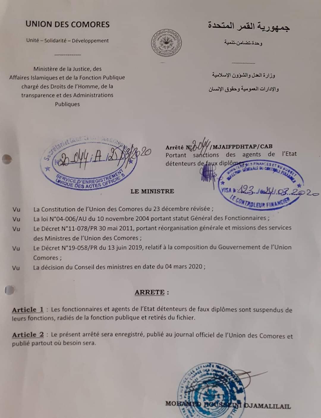 Les fonctionnaires et agents de la fonction publique qui ont des faux diplômes sont tous suspendus de leurs fonctions. Et ils sont également radiés et ne percevront pas leur salaire.
