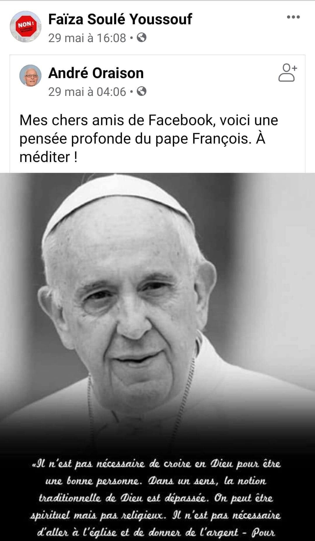 Ci-jointe, la capture d’écran de ce qu’on reproche à Faïza. D’avoir cliqué « PARTAGER » le 29 mai une publication d’ André Oraison sans commentaire d’une citation attribuée au pape François.