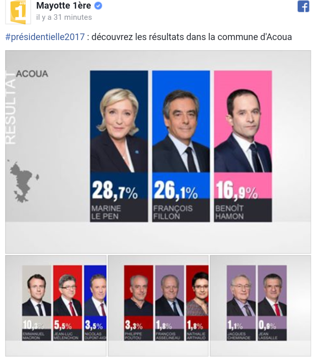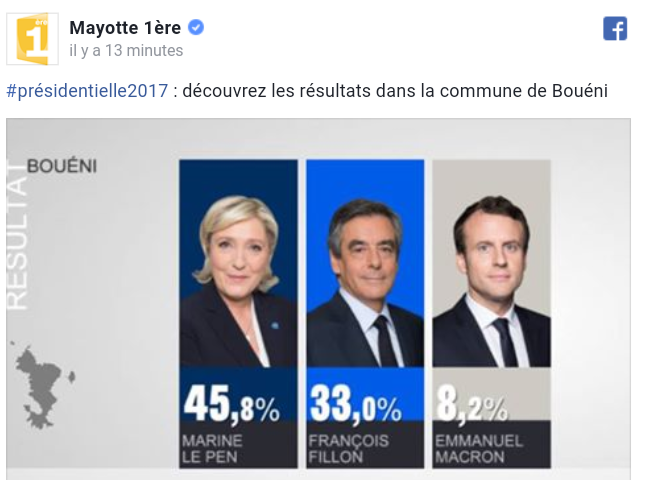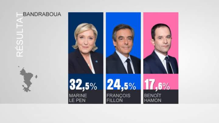Marine Le Pen a été choisie par les mahorais selon le site linfokwezi. À Mayotte dans la commune de Bouéni, la candidate du Front National a su convaincre et le résultat est là, elle a obtenu un score remarquablement haut, à savoir 45,81%. Pour l’instant, il s’agit de la commune dans laquelle la candidate obtient le meilleur score. Elle est suivi de François Fillon avec 33,05%.