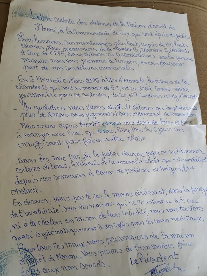 C’est dans une lettre ouverte signée par le résident des prisonnier et cachetée par le gardien en chef de la maison d’arrêt de Moroni, comme pour assurer son authenticité, que les détenus dénoncent les dures conditions dans lesquelles ils sont livrés. Cellule surpeuplée, insalubrité, manque de soin…, les prisonniers appellent « la communauté de ceux qui sont épris de justice » à faire réagir l’es autorités compétentes.
