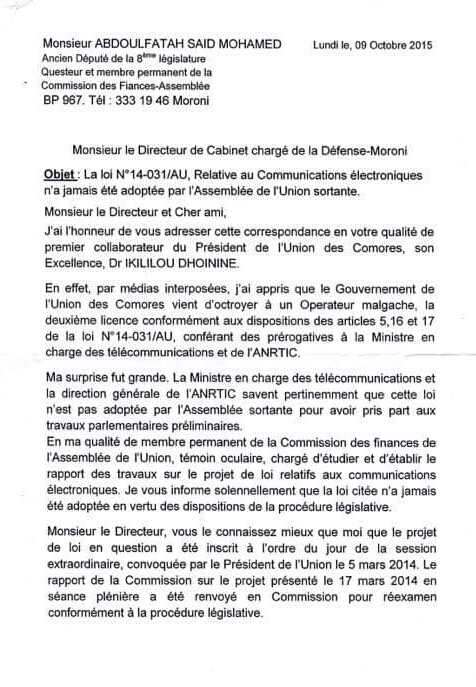 Par ailleurs, les députés persistent que la loi des Communications numériques n’a jamais été adoptée en séance plénière. En témoigne, ce courrier d’octobre 2015, du député Abdoulfatah Said Mohamed adressé à Boléro alors Directeur de cabinet du président Ikililou Dhoinine.