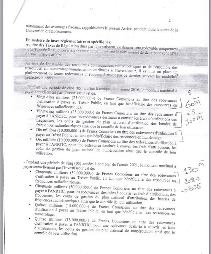 Les redevances d’utilisation initialement fixées à 25 millions de francs annuelle pourraient atteindre 1 milliard de nos francs. Au nom de la loi sur la concurrence, les élus estiment que Comores Telecom qui paie un plus de 2,1 milliards d’impôts serait lésé par l’arrêté interministériel de Mamadou.