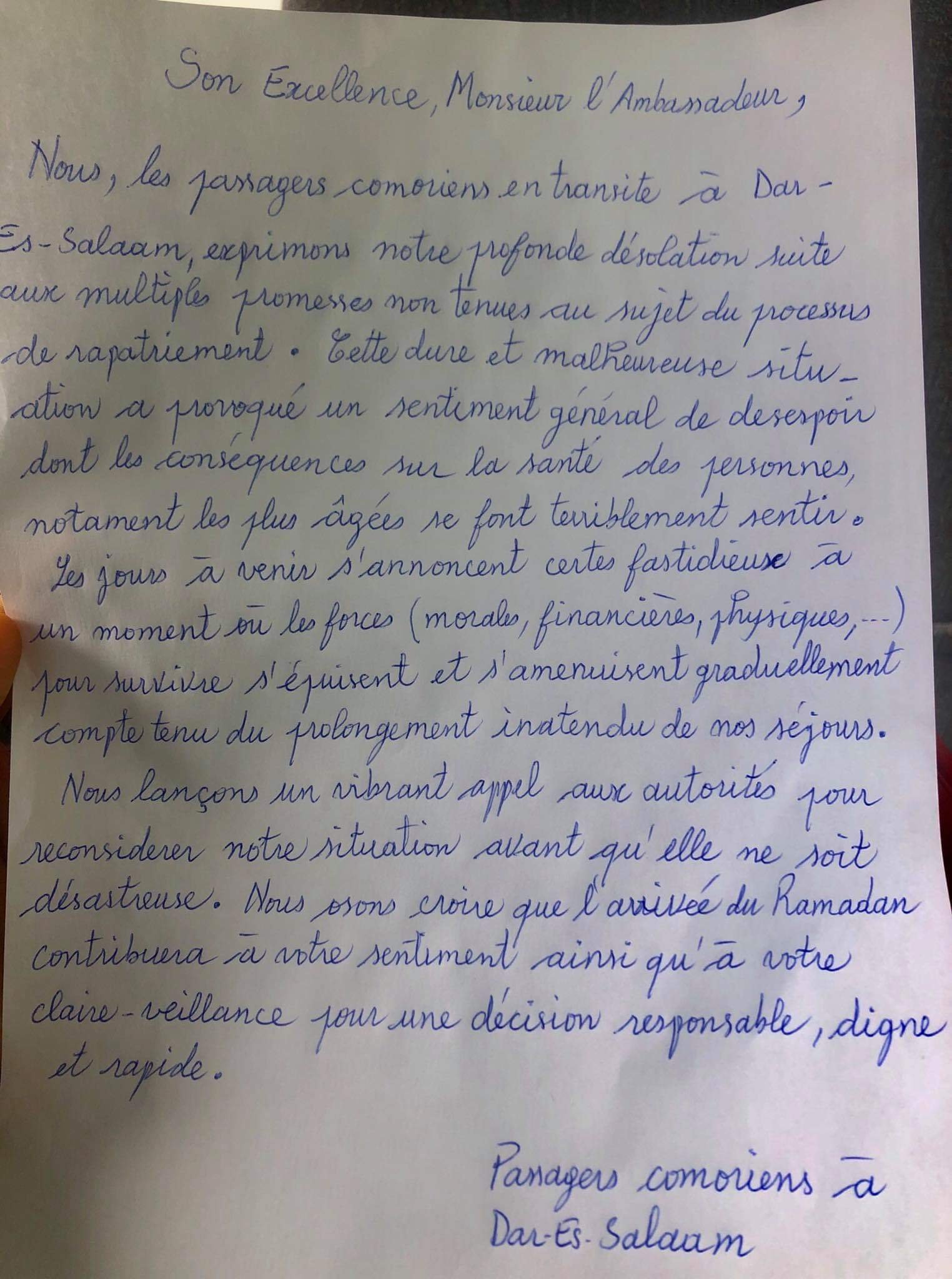Lettre des passagers bloqués en Tanzanie à l’ambassadeur