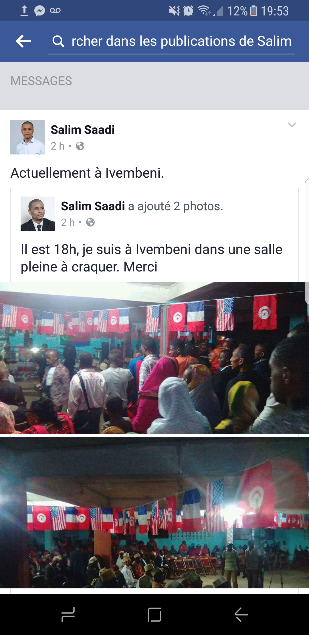 Dans une salle pleine à craquer à Ivembeni, on voit plusieurs drapeaux mais pas celui de notre pays. Pourquoi ce manque de respect pour notre drapeau ? Zéro drapeau comorien comme vous pouvez le voir, l’image fait penser à une salle à Mayotte ou La Réunion.