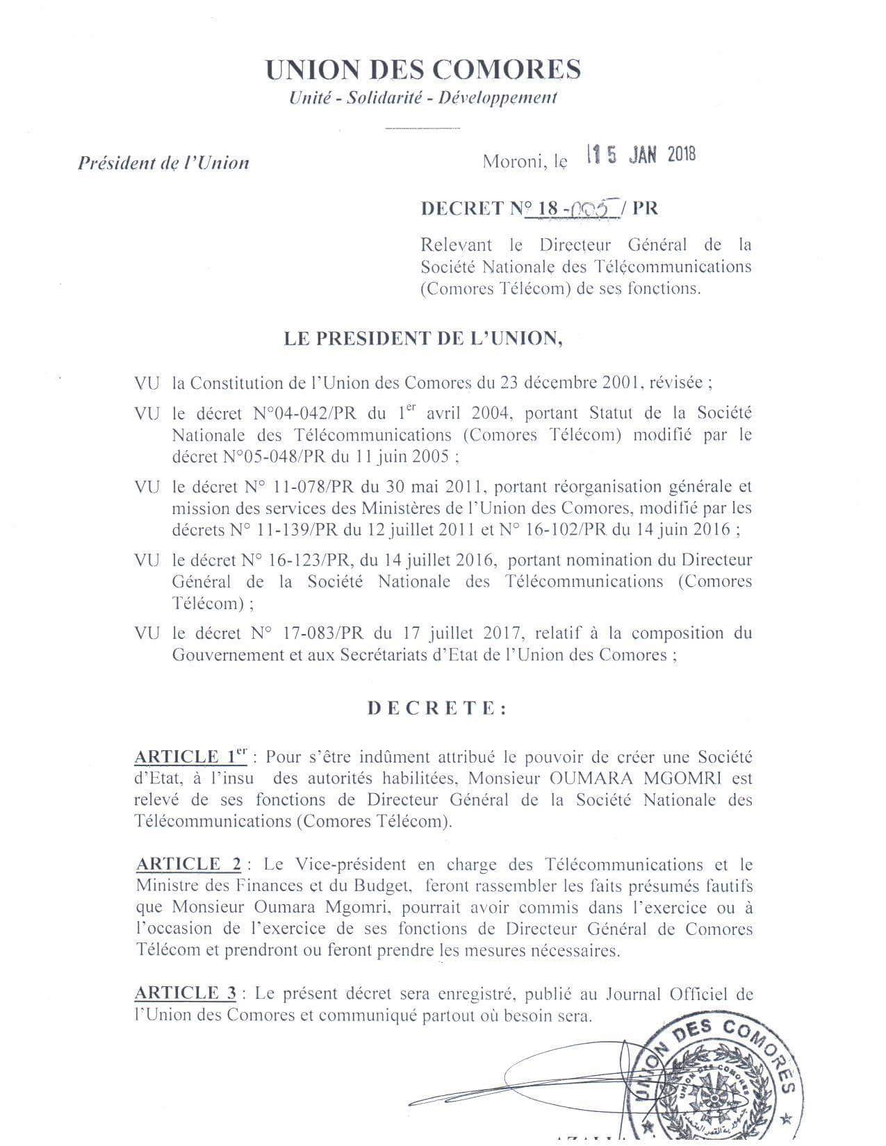 C’est l’information majeur de la journée. Oumara Mgomri est officiellement limogé de son poste de directeur général de Comores telecom. Dans le décret Nº18-005 du lundi 15 janvier c’est à dire aujourd’hui, on peut lire dans l’article premier « pour s’être indûment attribué le pouvoir de créer une société d’État, à l’insu des autorités habilitées, Oumara Mgomri est relevé de ses fonctions de directeur général de Comores telecom « .