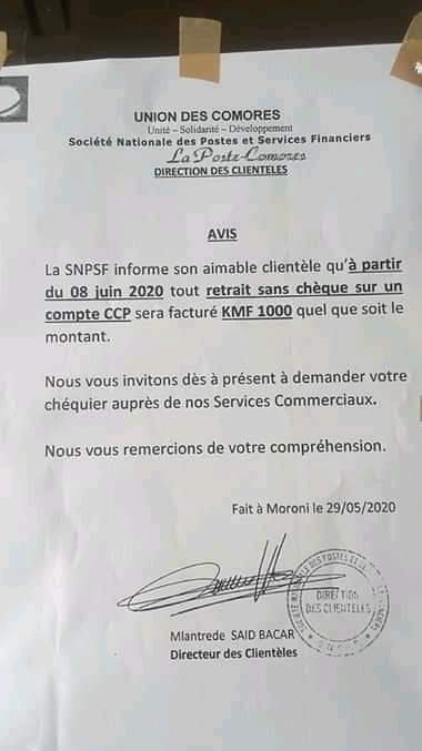 Une décision qui a été prise sans fondement juridique. Une simple petite note : » la SNPSF informe son aimable clientèle qu’à partir du 08 juin 2020 tout retrait sans chèque sur un compte CCP sera facturé KMf 1000 quelque soit le montant « , peut-on lire sur cette note signée par Mlantrede Said Bacar. Au-delà des détournements des fonds perpétrés au sein de cette société, sa direction se permet d’arnaquer ses clients durant cette période marquée par la crise provoquée par le Coronavirus.