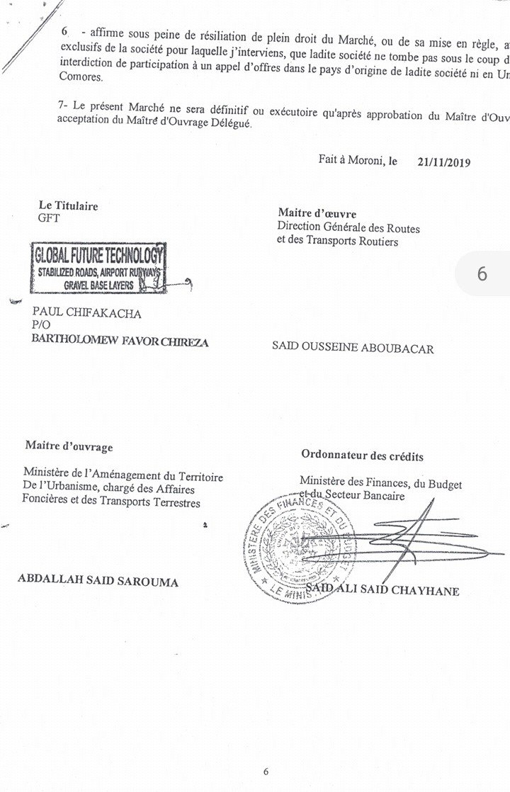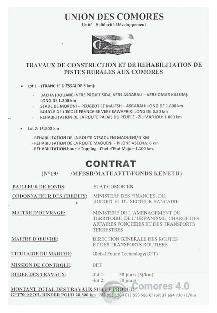 Le directeur technique et des opérations de la société Global future technology ( GFT) est un homme heureux. Celui qui se présente comme le ”le messie des routes » venait de signer le 21 novembre 2019 un juteux contrat d’un peu plus de 783 millions de francs pour la construction et la réhabilitation de 20.800 kilomètres de pistes rurales aux Comores.