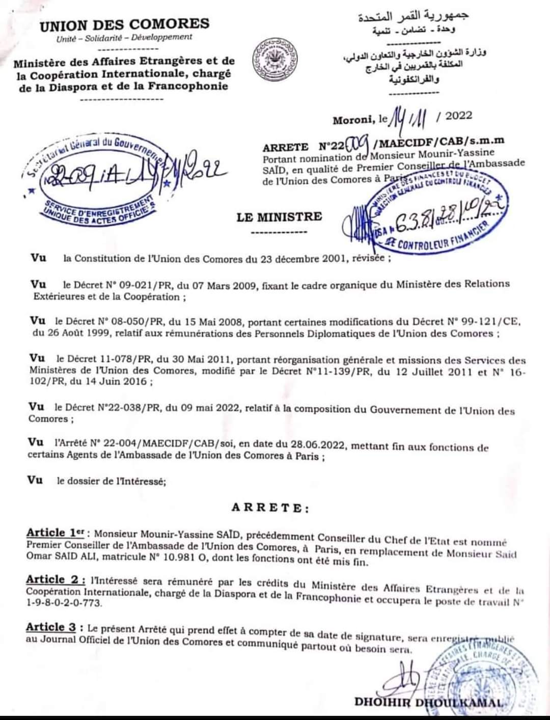 Celui qui insultait des membres de la diaspora a fini par avoir une belle promotion. Mounir alias FFU est nommé conseiller à l’ambassade des Comores à Paris.