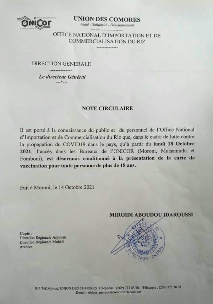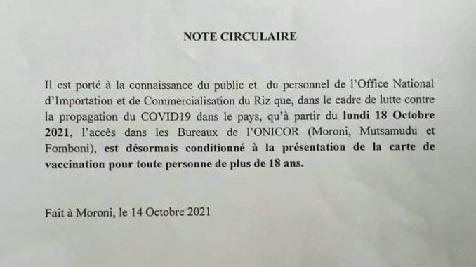 À partir de ce lundi matin, la carte de vaccination devient obligatoire dans les différents bâtiments de l’ONICOR, aussi bien pour le personnel de l’établissement que pour le public en général.