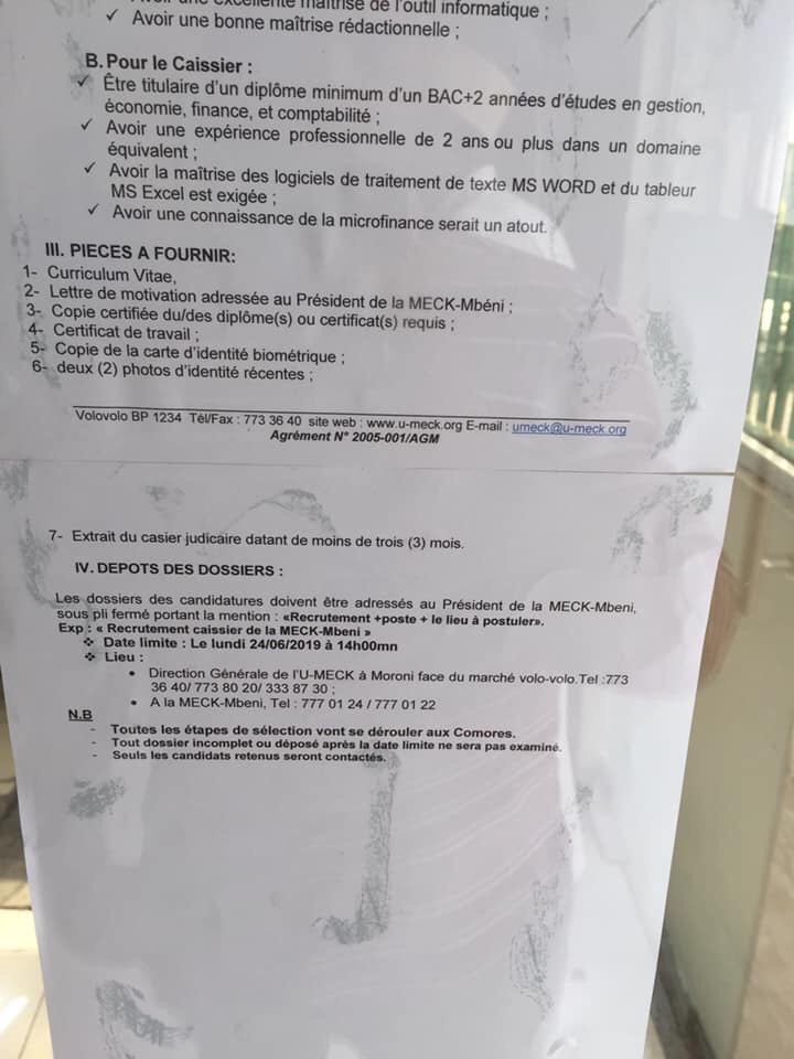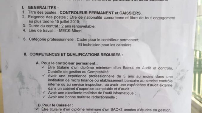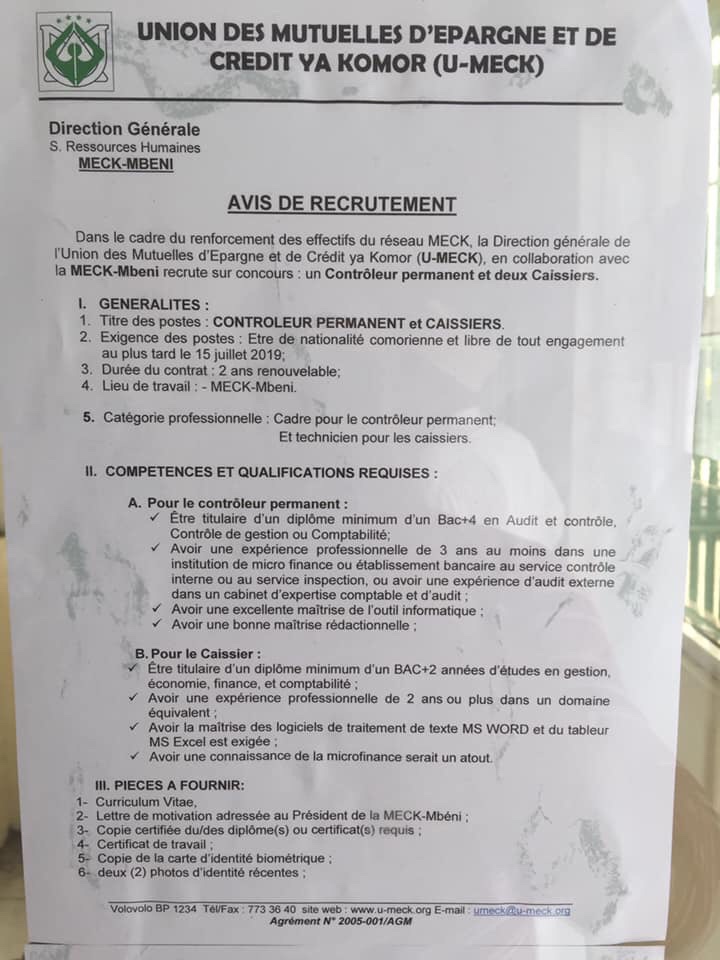 L’union des Meck recrute un contrôleur permanent et deux caissiers