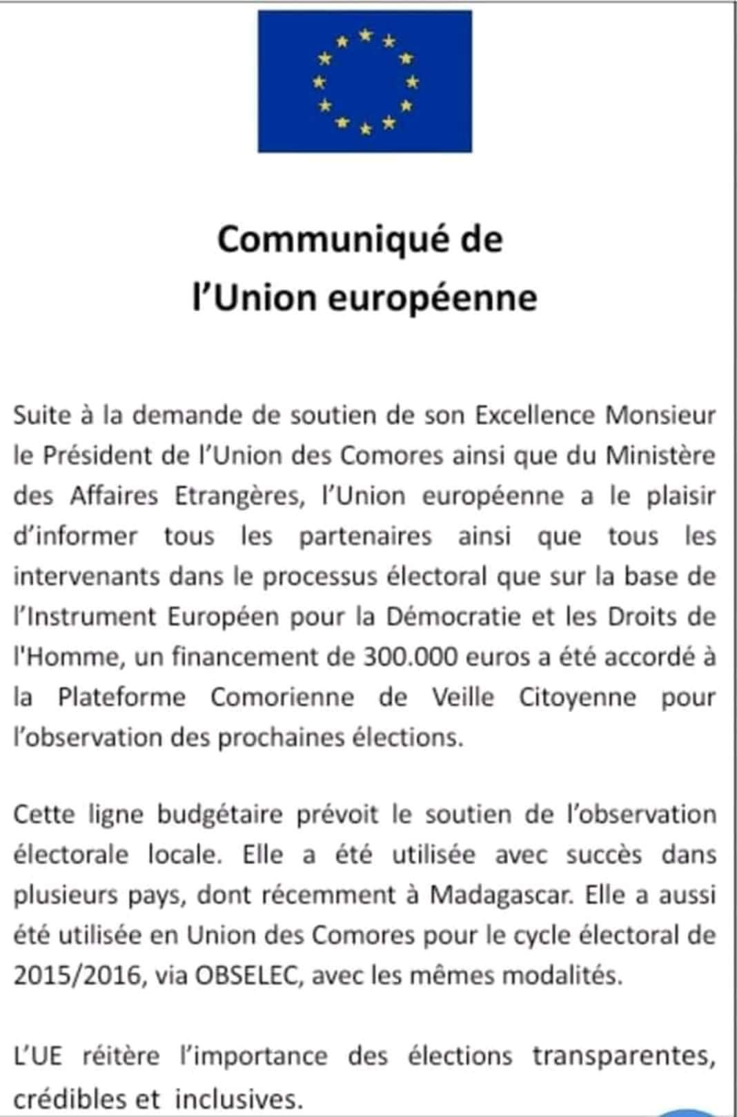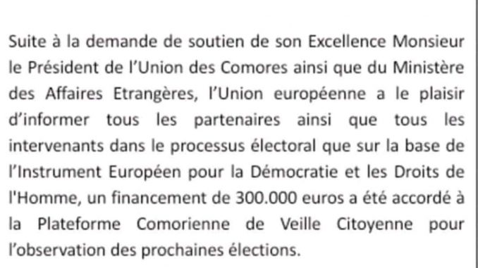 Communiqué de l’Union Européenne sur le financement d’ environ 150 millions KMF, accordé à la société civile pour l’observation des élections.