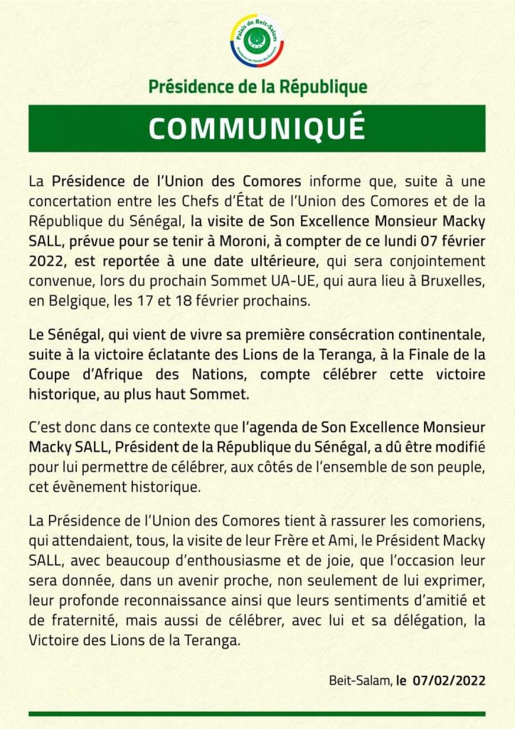 Le président sénégalais, Macky Sall a annulé son voyage aux Comores pour fêter la victoire de son pays à la CAN.