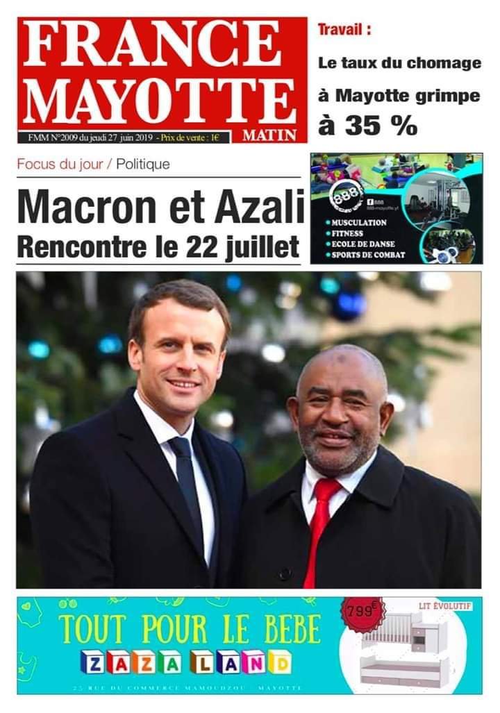 Le président Azali Assoumani et son homologue français Emmanuel Macron vont se rencontrer à Paris le 22 juillet selon nos confrères de Mayotte Hebdo. Plusieurs sujets au menu des discussions comme la question de Mayotte…. la sécurité, le développement…