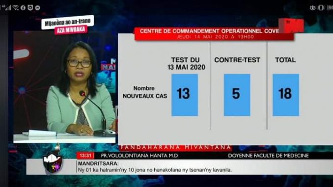 Madagascar enregistre autant de nouveaux cas que le 12 Mai. Ce 14 mai , Pr Hanta Marie Danielle Vololontiana, indique 18 nouveaux cas de coronavirus recensés mercredi, lors de son rapport quotidien des actualités autour de la lutte contre le coronavirus, jeudi. Treize d’entre eux ont effectué leur test mercredi tandis que les cinq autres font partie des 67 personnes initialement annoncées positives le 7 Mai et qui avaient subi de contre-tests. La porte-parole du Centre de commandant de lutte contre la Covid 19 souligne que 11 cas de contaminations enregistrés mercredi concernent des sujets basés à Moramanga tandis que les deux autres sont localisés à Toamasina.