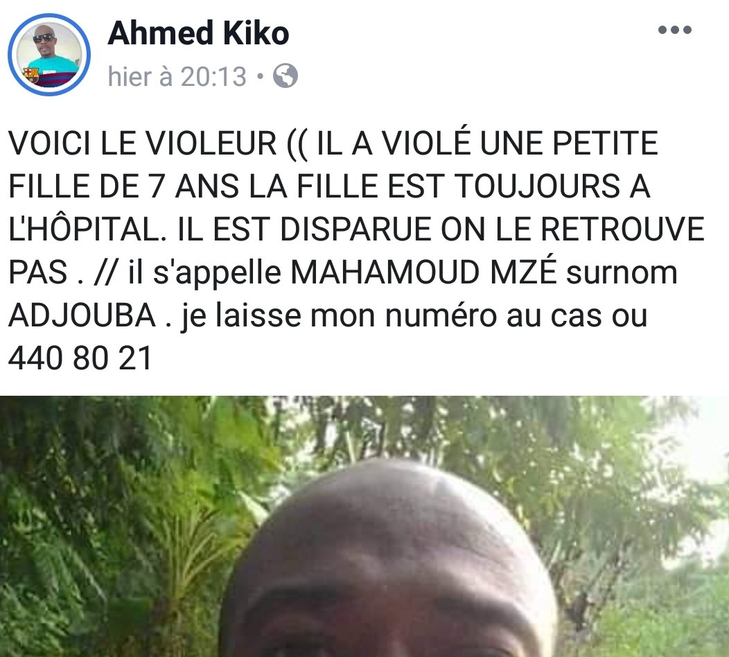 Mahamoud Mzé alias Adjouba est activement recherché. Il a vi0lé la petite fille innocente. Adjouba est originaire de Mitsamihouli et il a pris la fuite.