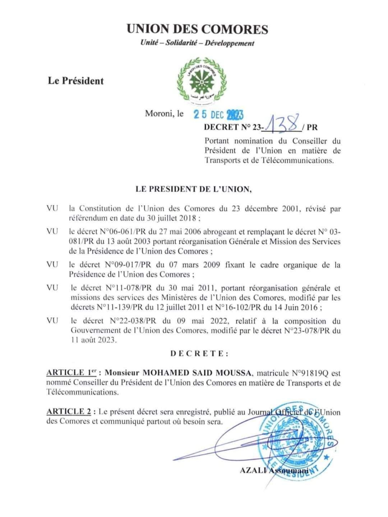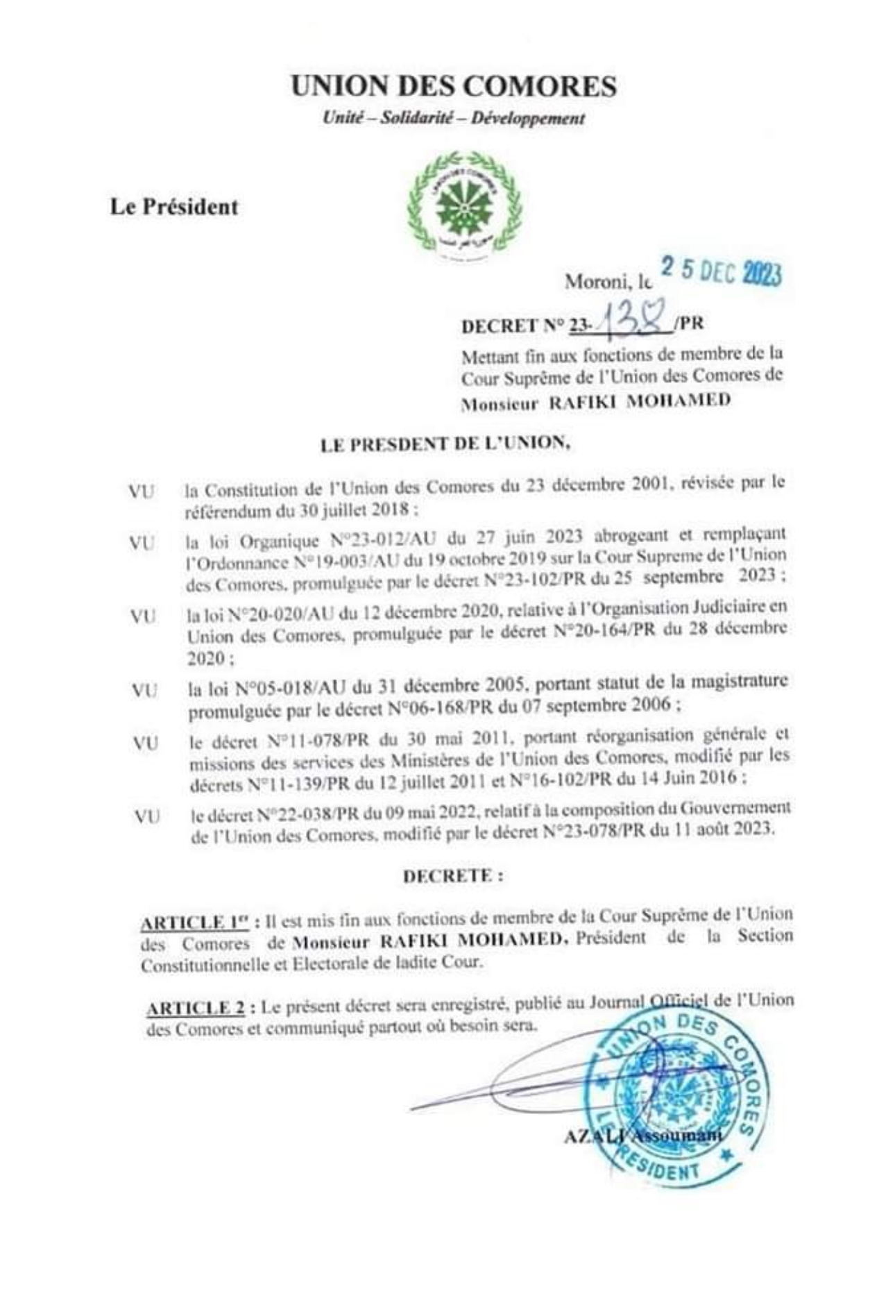 Une ombre inquiétante plane pendant cette période électorale alors que des faux décrets de radiation font surface, cette fois-ci dans le domaine politique. Un décret frauduleux prétend que Rafiki, président de la section constitutionnelle et électorale, victime de faux décrets de radiation. Comoresinfos a eu une confirmation officielle que ce document de radiation est complètement faux :
