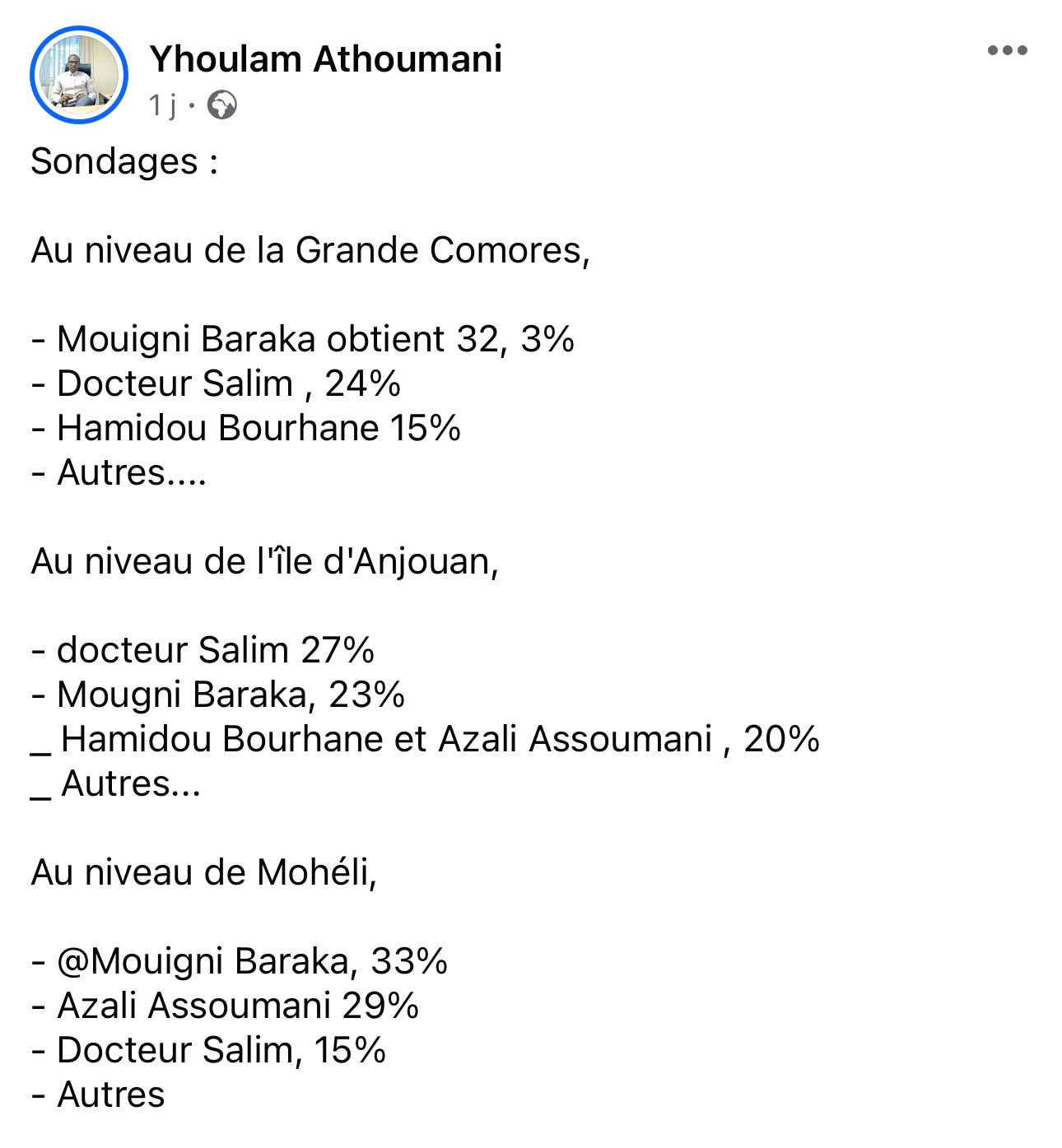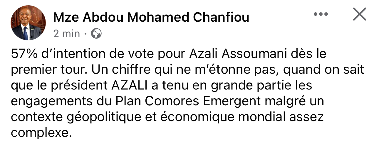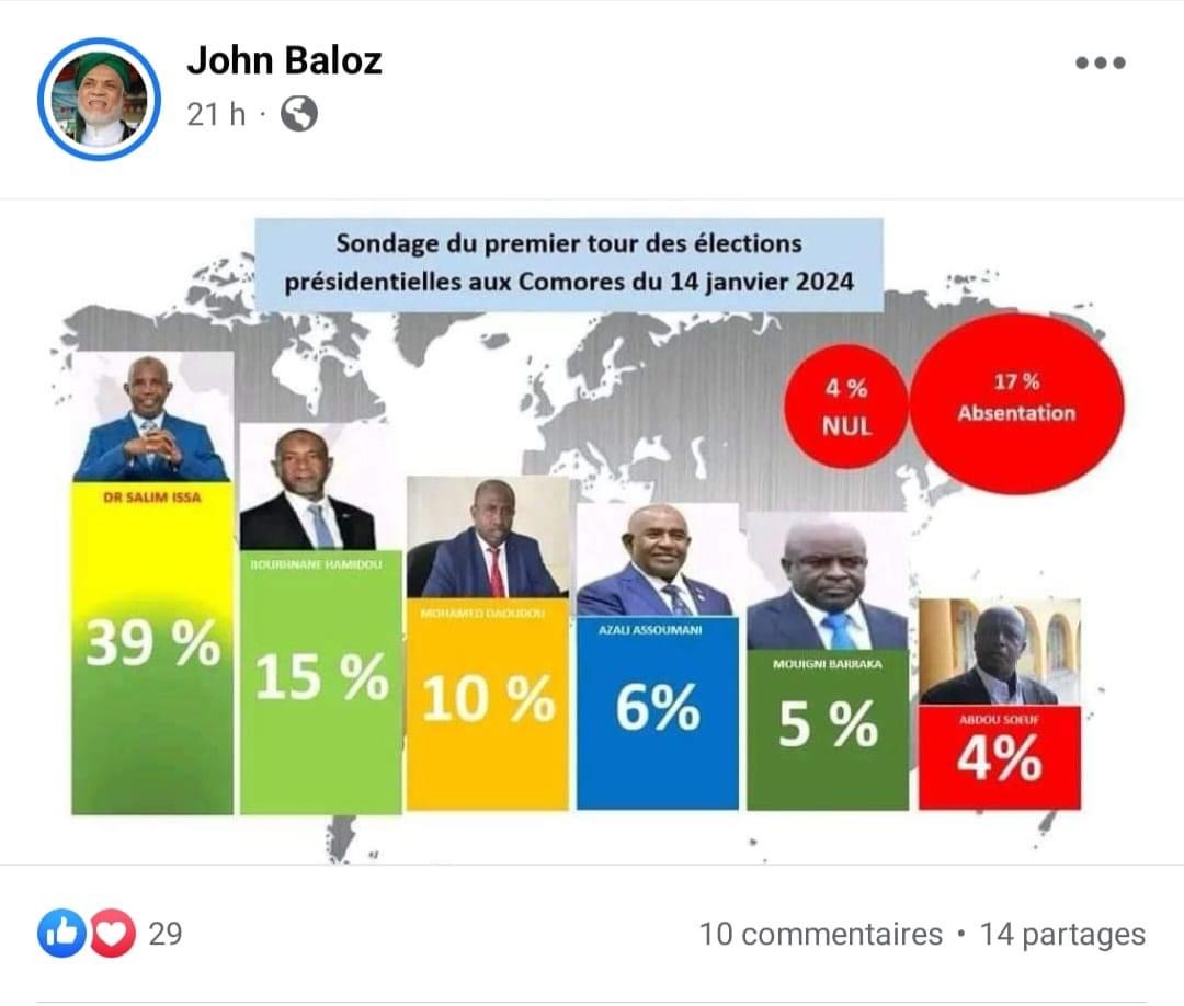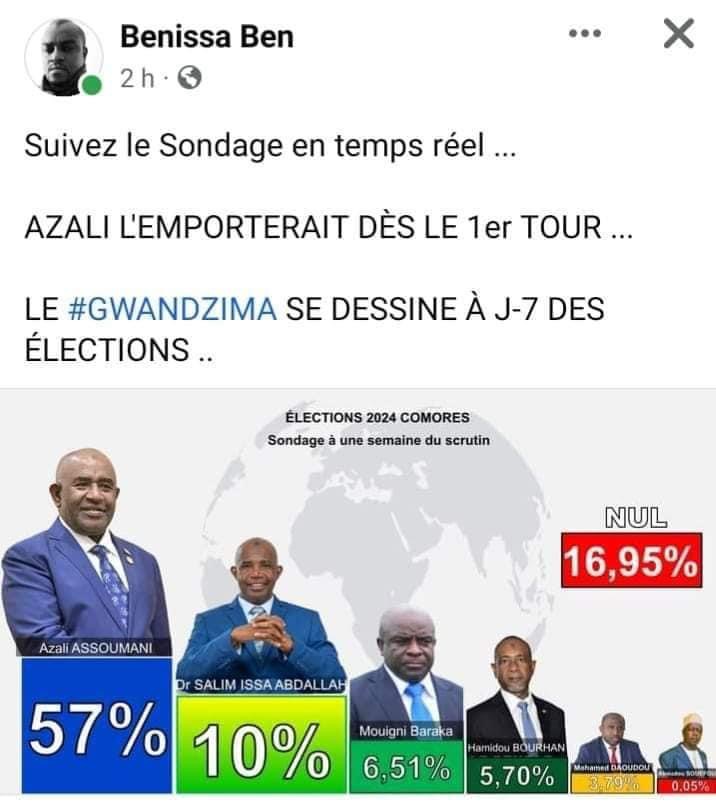 Il est important de souligner que les Comores ne disposent d’aucun institut de sondage officiel, laissant ainsi la porte ouverte à des sondages publiés exclusivement par des partisans des candidats. Aucun média sérieux n’a repris ces données, soulignant le manque de crédibilité de ces informations.