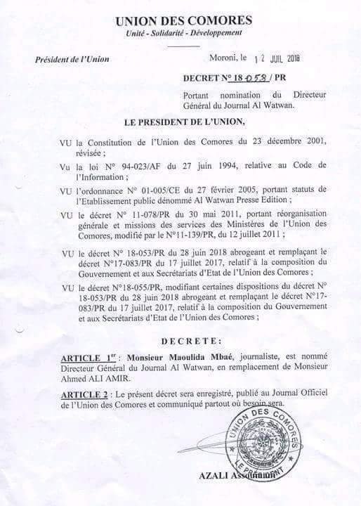 Maoulida Mbaé remplace Ahmed Ali Amir à la tête d’Alwatwan. Il devient le directeur général du journal gouvernemental.