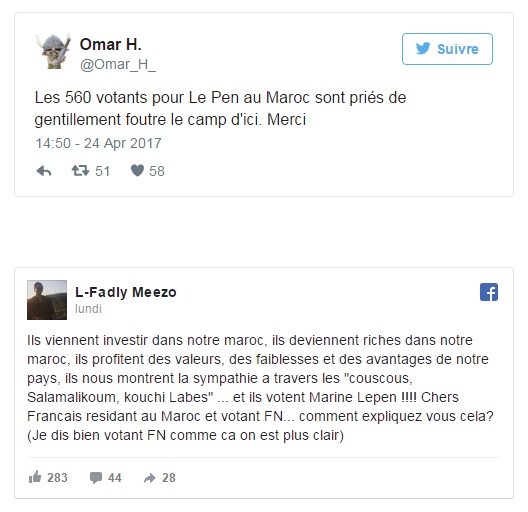 Les internautes Marocains demandent aux Français ayant voté pour Marine Le Pen de quitter le Maroc comme le rapporte le quotidien en ligne le360.ma.