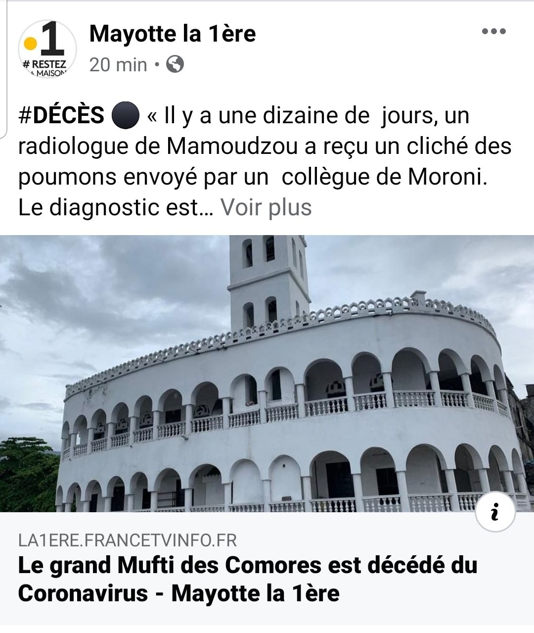 Par Mayotte 1ère . « Il y a une dizaine de jours, un radiologue de Mamoudzou a reçu un cliché des poumons envoyé par un collègue de Moroni. Le diagnostic est formel : l’image représente les lésions typiques du tissu pulmonaire provoquées par le coronavirus.Ce patient était le Grand-Mufti des Comores ».La directrice de l’Agence Régionale de Santé de Mayotte , Dominique Voynet a révélé cette information ce jeudi lors d’une conférence téléphonique avec la presse locale à Mayotte. Elle affirme que les autorités comoriennes en ont été informées.Le Grand Mufti des Comores Said Toihir est décédé le 8 avril dernier, au moment où une évacuation sanitaire était envisagée.« Nous savons qu’il y a du Covid-19 aux Comores, mais nous ne savons pas s’il y en a beaucoup » dit Dominique Voynet ; « on peut s’interroger sur les conditions dans lesquelles se sont déroulées les soins et les obsèques de cette personnalité ».« Si les autorités comoriennes ont besoin d’aide pour faire face à une épidémie, elles doivent la demander. De mon côté j’ai été approchée par le Quai d’Orsay, je leur ai dit que Mayotte ne peut pas aider compte tenu de ses moyens.