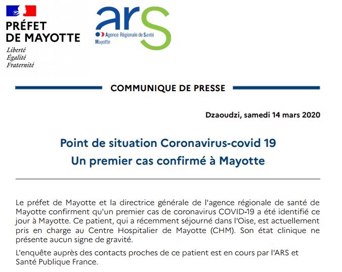 Mayotte a déjà détecté son premier patient porteur de coronavirus. La préfecture vient de le confirmer par communiqué.