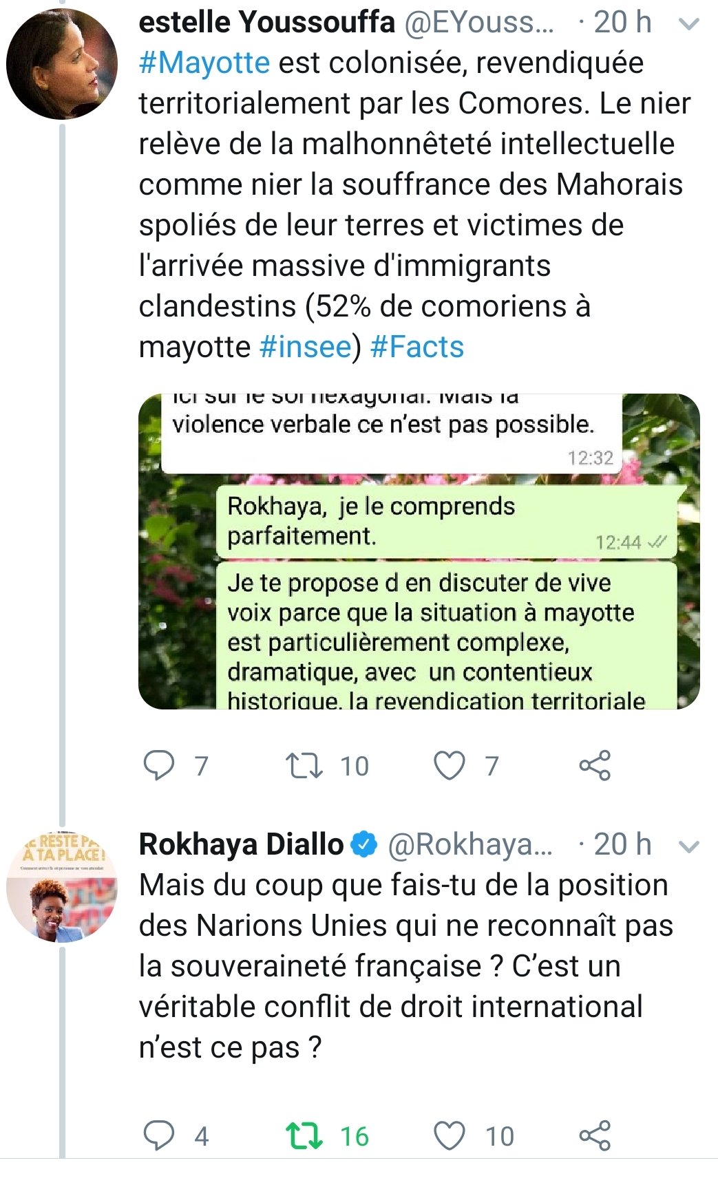 « Mayotte est colonisée, revendiquée territorialement par les Comores. Le nier relève de la malhonnêteté intellectuelle comme nier la souffrance des Mahorais spoliés de leur terres et victimes de l’arrivée massive d’immigrants clandestins (52% de comoriens à mayotte #insee) « .
