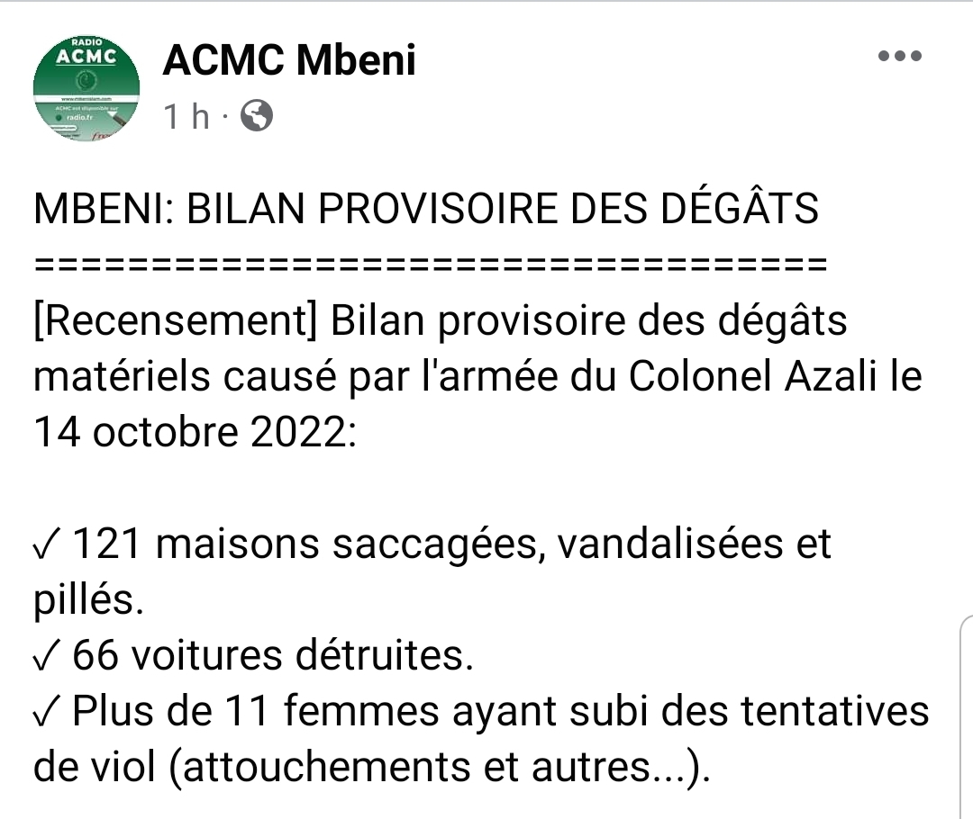 C’est un désastre. Selon les médias de Mbéni, Acmc, Mbéni news,.. plusieurs femmes ont été agressées sexuellement par des militaires. Toujours selon ces médias, il y’aurait 11 femmes qui ont subi des attouchements sexuels et autres…