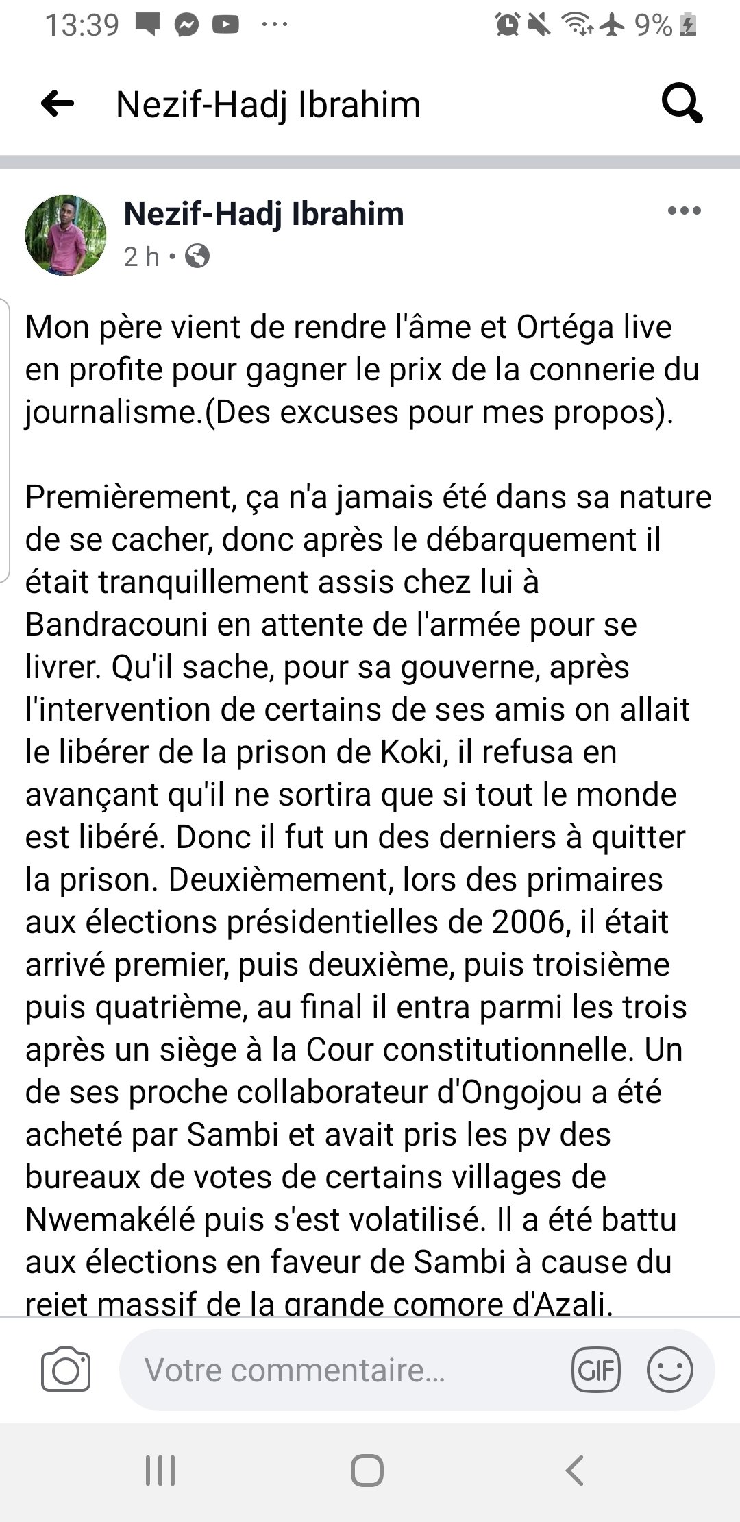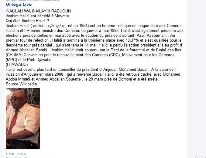 La famille de l’ancien premier ministre Ibrahim Halidi Abderemane est très remontée. Une colère compréhensible après la publication du journaliste Ortega qui est à la recherche du Buzz. Ortega aurait dit des mensonges sur le défunt. Voici le message bouleversant du fils de l’ancien premier ministre :
