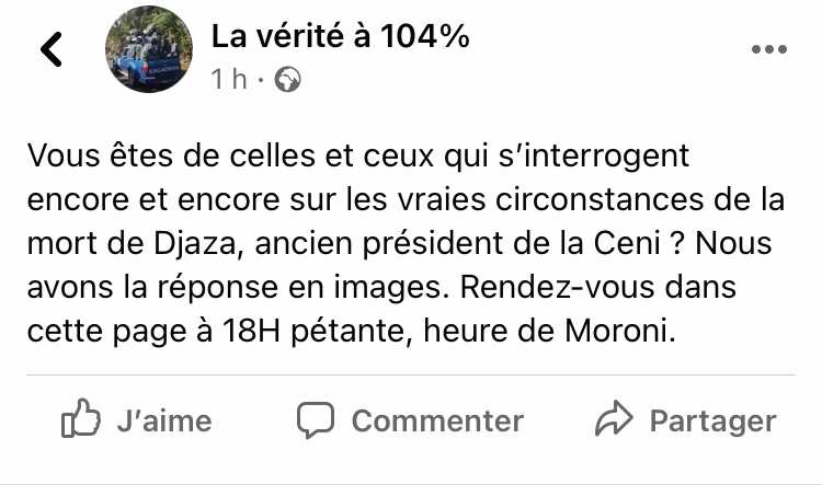 Une page Facebook créée, selon toute apparence, spécialement pour lever le voile sur le mystère sui règne sur la mort de l’ancien président de la Ceni Ahmed Djaza, a promis de rendre publiques ce soir des images permettant à l’opinion d’avoir une idée claire sur les circonstances de la mort de l’ancien homme fort de la Ceni. « La vérité à 104% », soit le nom que s’est donné la page en question, nous donne rendez-vous à 18h ce samedi, heure de Moroni. À lire aussi sur le même sujet : https://www.comoresinfos.net/le-dr-djaza-president-de-la-commission-electorale-ete-assassine/