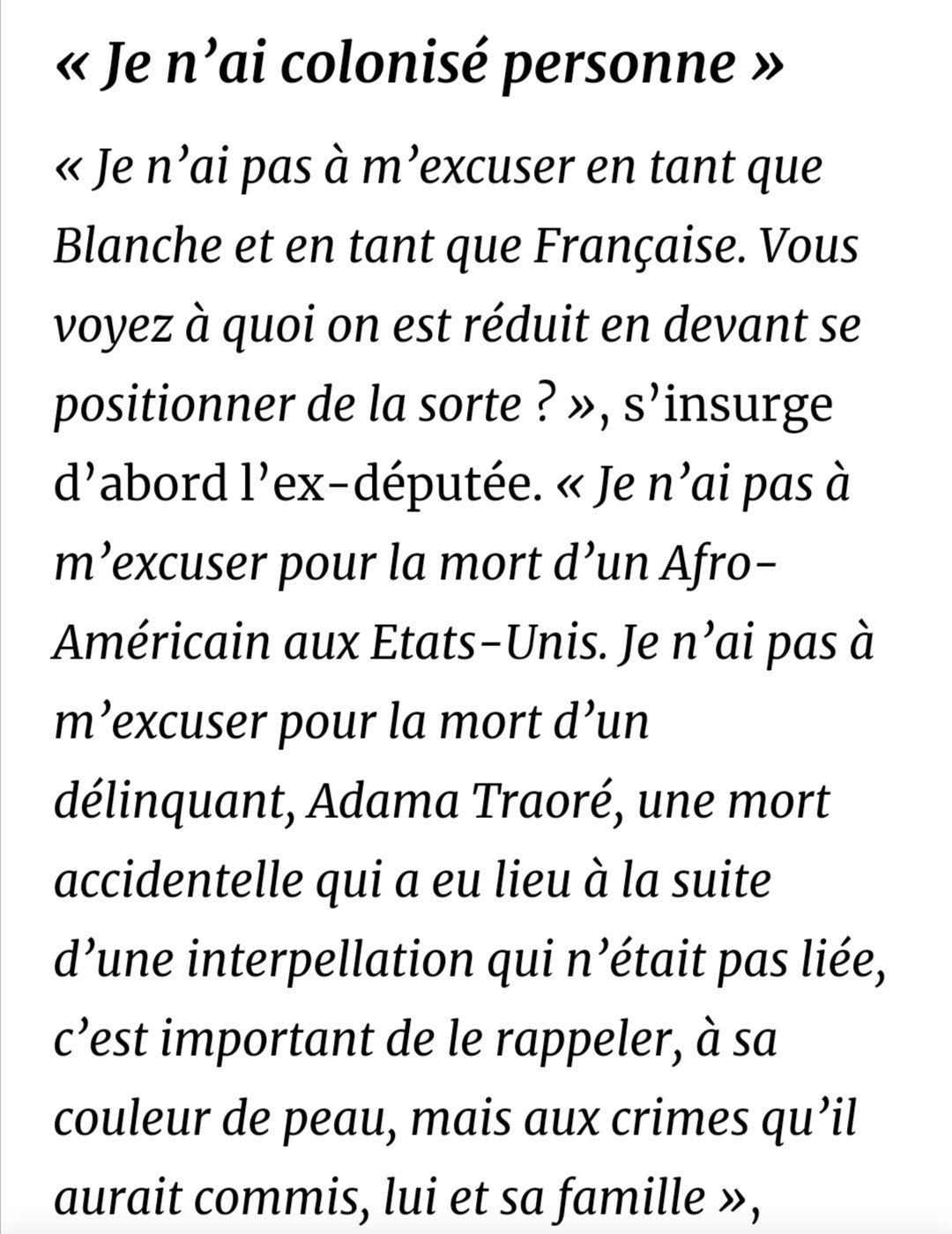 La petite-fille de Jean Marie Le Pen, Marion Maréchal a déclaré «je n’ai pas à m’excuser en tant que Blanche et en tant que Française » pour « la mort d’un Afro-Américain » et d’Adama Traoré, a affirmé mercredi soir dans une vidéo postée sur son site facebook.
