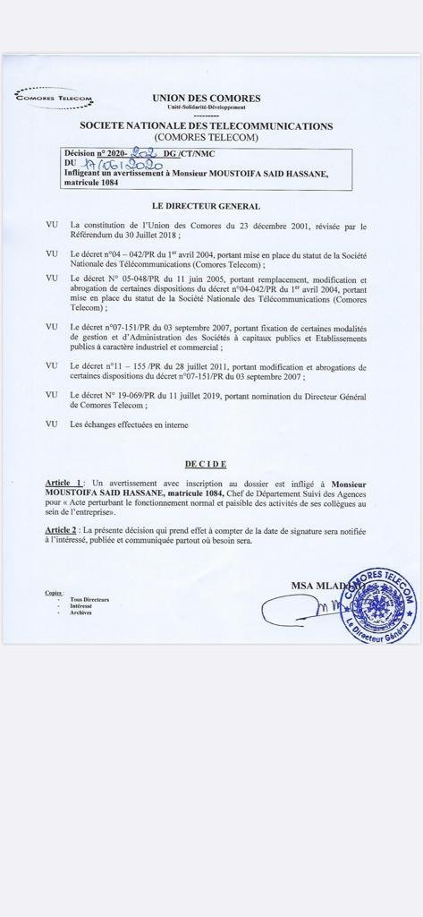 Une enquête administrative indépendante menée par plusieurs cadres de la société Comores Télécom sur l’affaire d’harcèlement sexuel commis par le chef de département suivi des agences a conclu que l’ancienne receveuse de l’agence de Comores Télécom de Volovolo a été bien harcelée par son Supérieur hiérarchique à plusieurs reprises, Moustoifa Said Hassane. Ce dernier devait être suspendu mais il a les mains longues. Après l’intervention d’une haute autorité politique auprès du directeur général Mladjao, Ce dernier décide d’avertir l’harceleur au lieu de le suspendre.