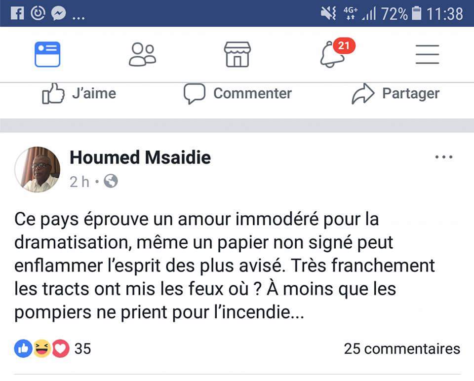 Je croyais que les hommes politiques vont tous monter au créneau pour condamner les auteurs de cet acte. Malheureusement, je suis surpris par la réaction de M Houmed Msaidie ancien ministre de l’intérieur pour ne pas dire premier flic du pays. Ce dernier n’a pas eu le courage de condamner avec la plus grande fermeté les auteurs de ce tract qui incite à la haine et la division dans le pays.