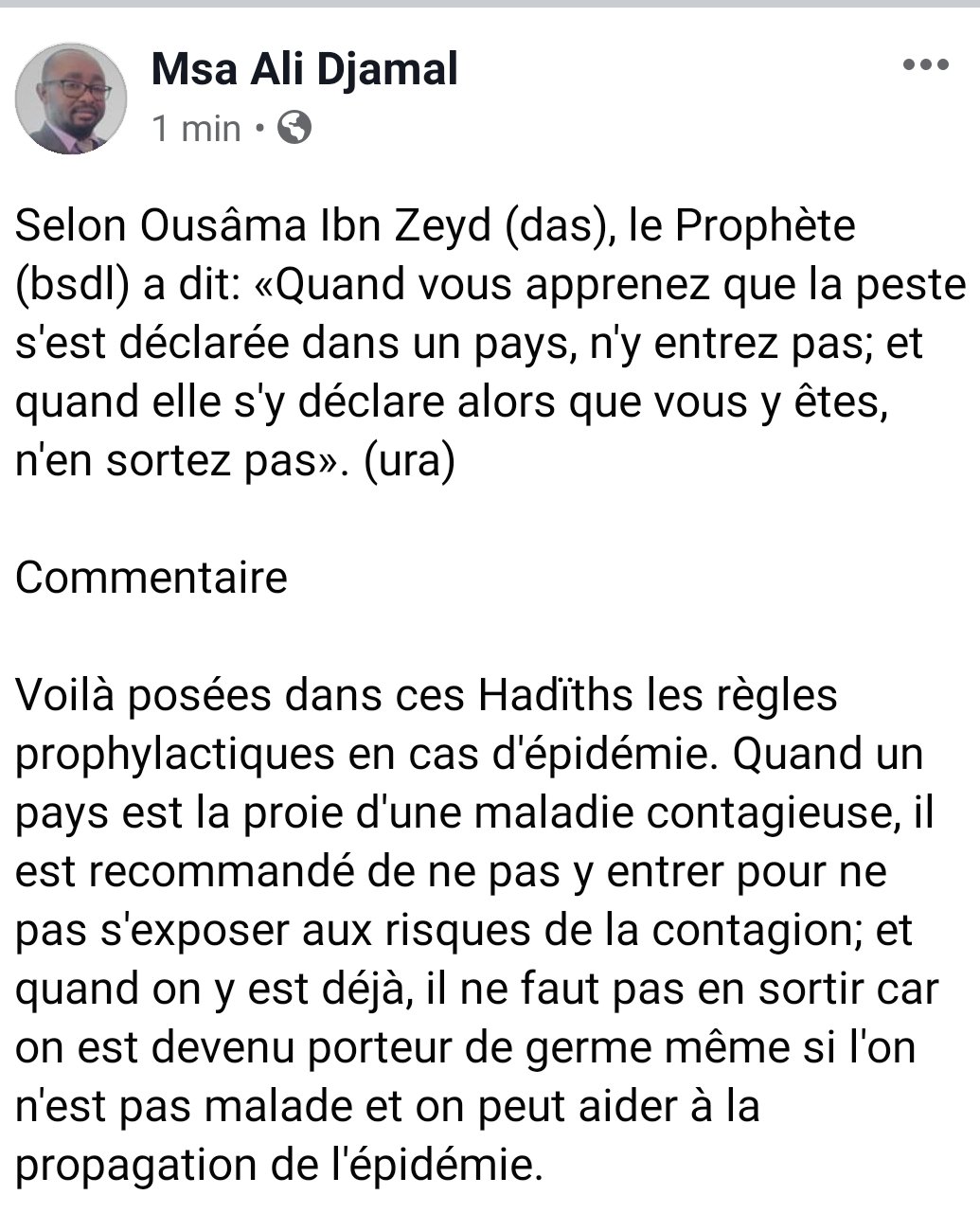 Le gouvernement ne veut pas que les étudiants Comoriens en Chine reviennent aux Comores. Les communiquants du gouvernement ont commencé le travail en utilisant des hadiths. C’est le cas de Msa Ali Djamal, ancien directeur de l’ortc et chargé de communication au ministère des affaires étrangères.