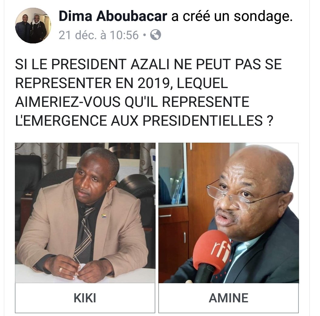 M’sa Ali Djamal souhaite que El-Amine Souef remplace Azali à la présidentielle. Si Azali ne peut pas se représenter pour des problèmes de santé. En répondant au sondage sur Facebook de Dima Aboubacar, M’sa Ali Djamal confirme que le président Azali Assoumani est peut-être dans l’incapacité de se présenter à la présidentielle 2019 pour des raisons de santé.