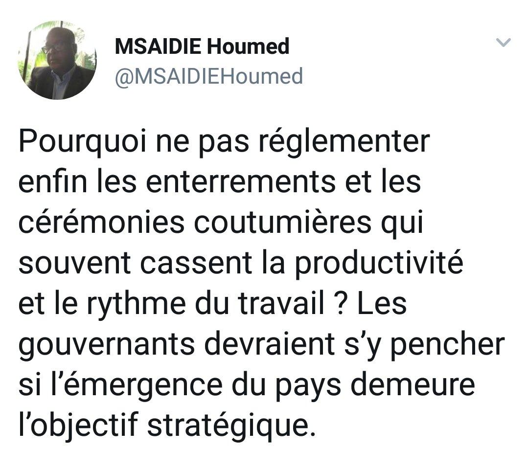 C’est sur Twitter que l’ancien ministre de l’intérieur, Houmedi Msaidié demande au président Azali Assoumani de réglementer le grand mariage et les enterrements car ils cassent le rythme de travail. Pour arriver à l’émergence, il faut une réglementation pour plus de productivité.
