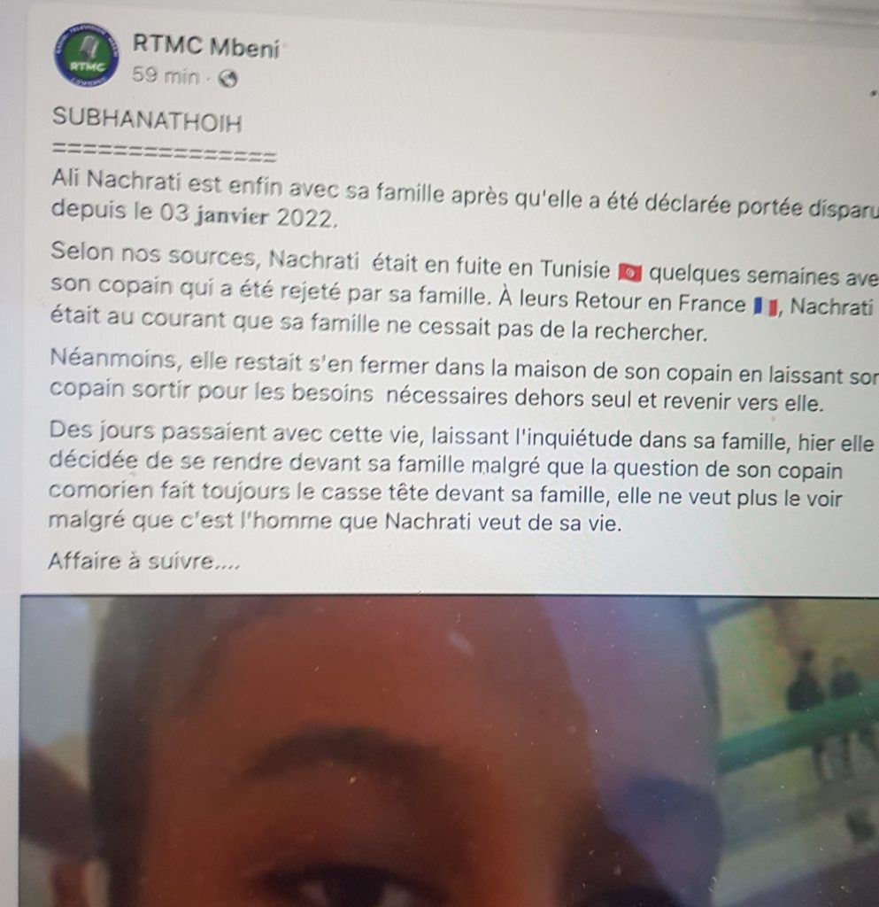 Selon nos confrères de Rtmc Mbéni, Nachrati aurait été en Tunisie avec son amoureux pendant que sa famille était à sa recherche en France. Les amoureux étaient en Tunisie mais malheureusement la famille de son copain tunisien a rejeté le couple.