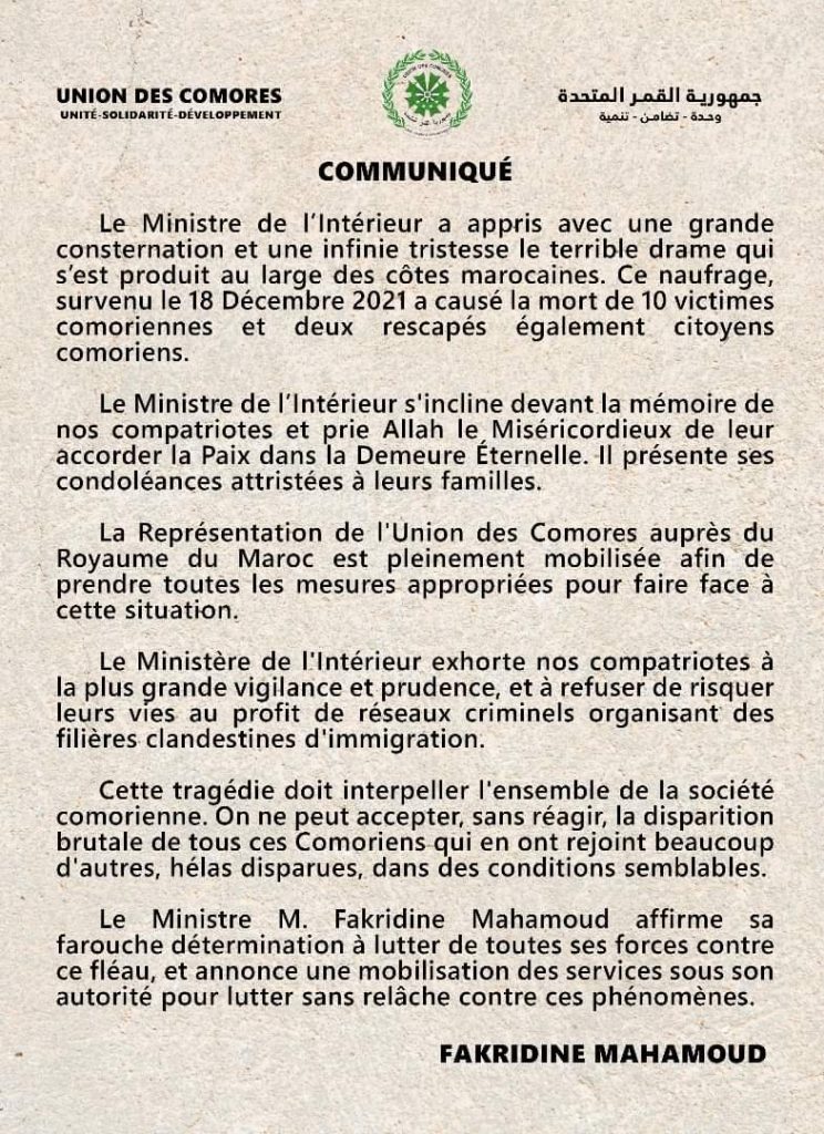 Naufrage : communiqué du ministère de l’intérieur suite à la mort de 10 comoriens